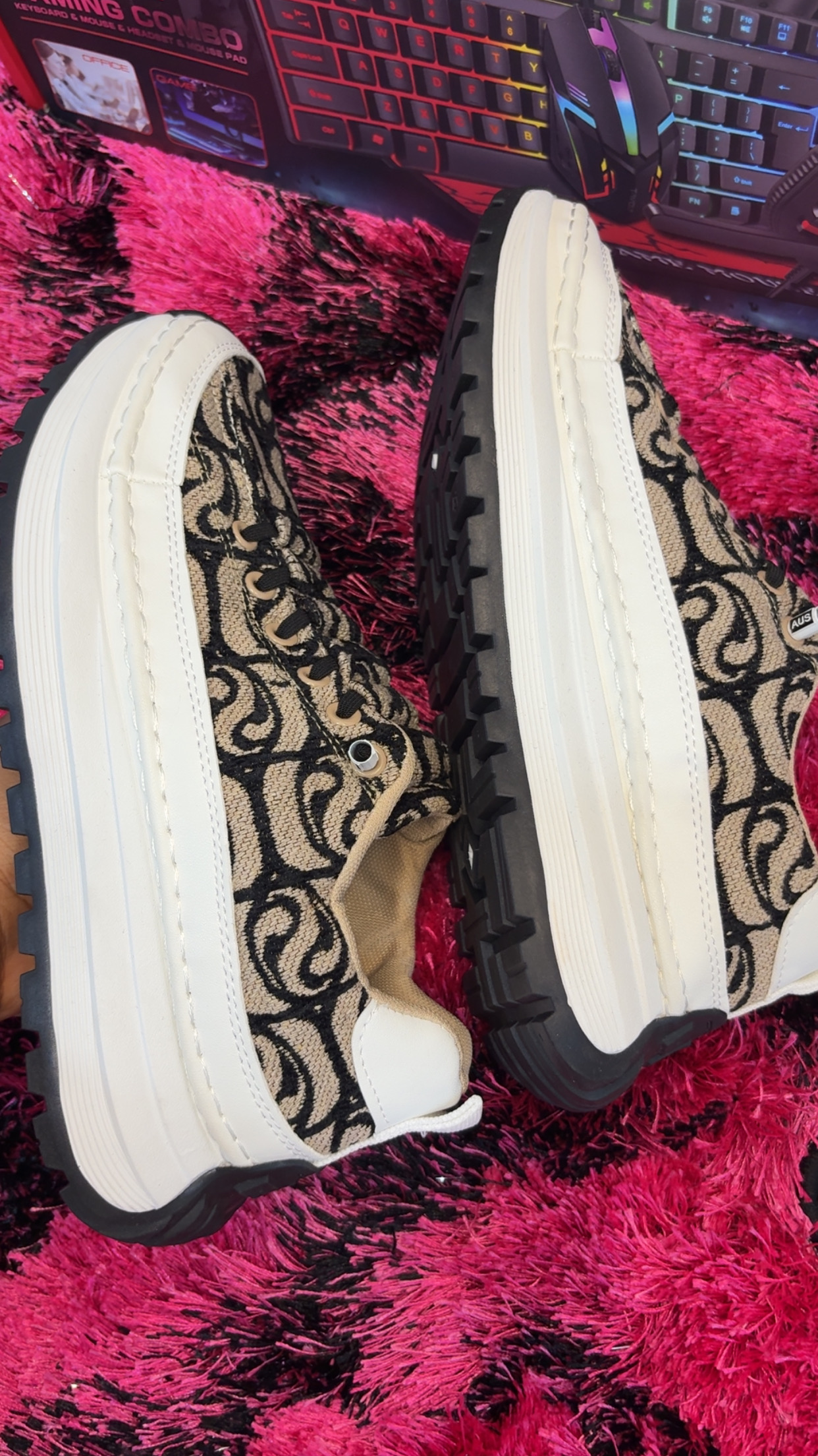 The sneakers feature a unique beige and black woven patterned upper with intricate designs, giving them a premium and eye-catching look. The breathable fabric ensures comfort while keeping your feet cool and stylish. The lace-up closure allows a snug and adjustable fit, making these sneakers versatile for different occasions.