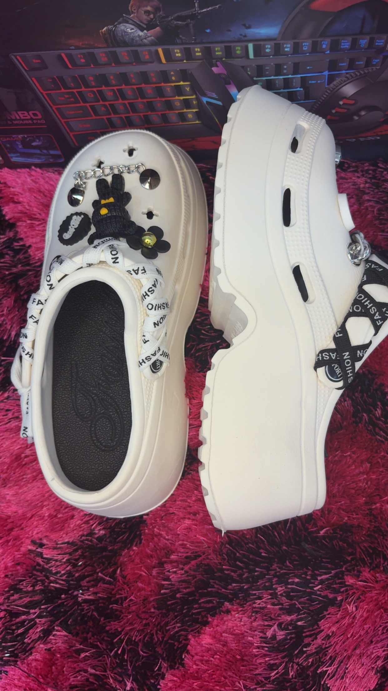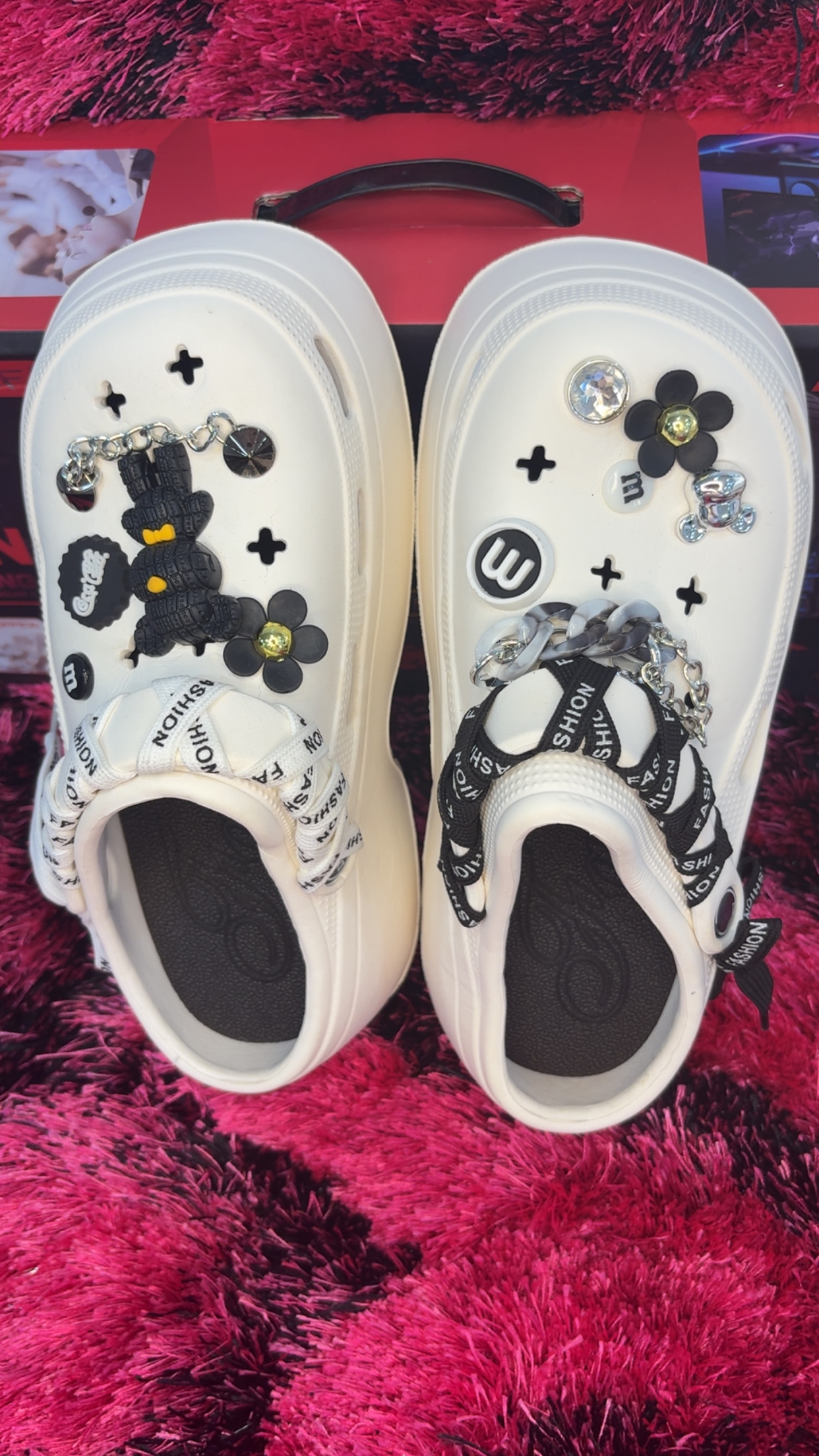 Redefine comfort and fashion with these unique unisex white clogs, designed to blend playful style with everyday practicality. Unlike ordinary slip-ons, these clogs feature eye-catching decorative charms including floral designs, cartoon-inspired accents, shiny jewels, and metallic chains – transforming a simple clog into a true fashion statement.