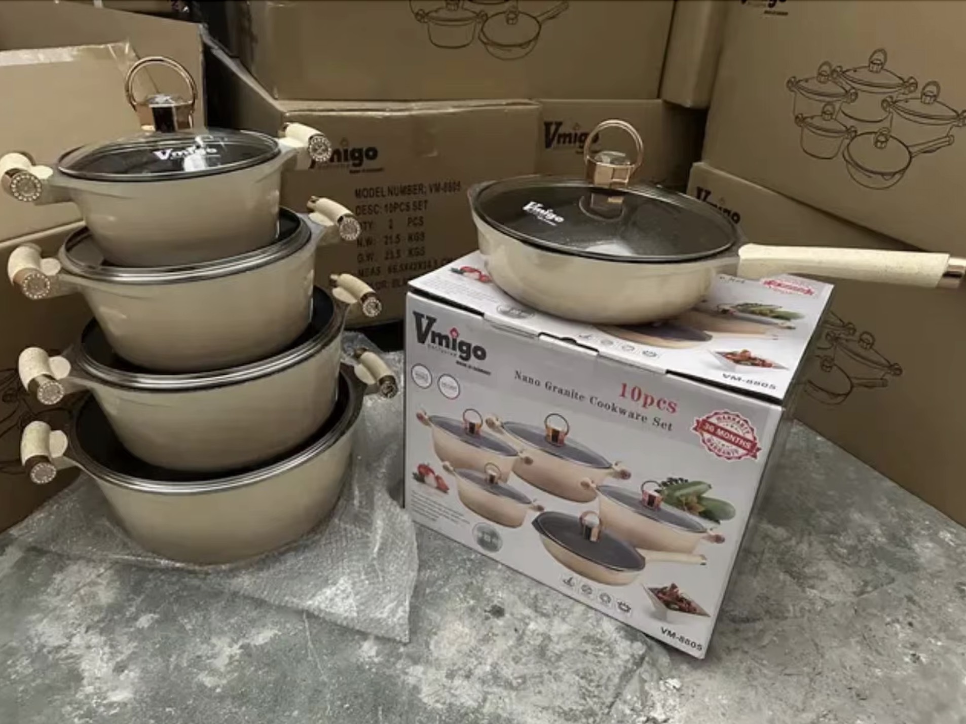 Elevate your culinary experience with the Vmigo Exclusive 10-Piece Nano Granite Cookware Set. Engineered with German-inspired precision, this set features a heavy-duty die-cast aluminum construction that ensures even heat distribution and long-lasting durability. Each piece is coated with a premium 2-layer marble non-stick surface, allowing you to cook with minimal oil and enjoy effortless cleanup.